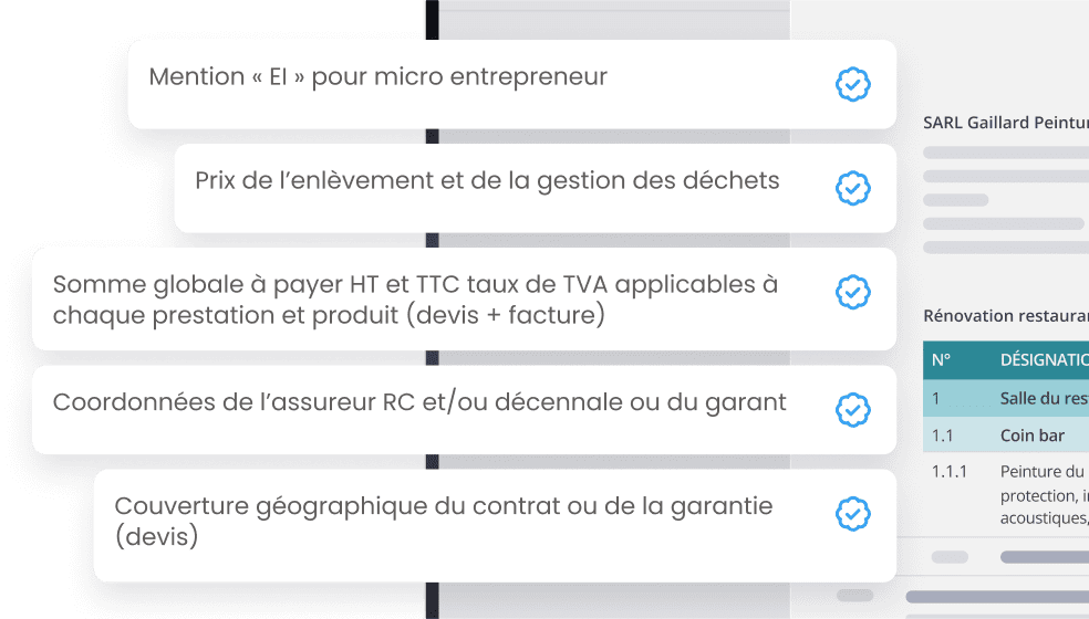 Ne prenez plus le risque d’avoir des amendes, 19 mentions légales obligatoires sont ajoutées automatiquement sur vos documents. Nous gérons l’autoliquidation pour la sous-traitance et les attestations de TVA pour les travaux de rénovation.