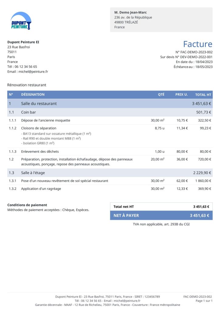 Utilisez un exemple de facture bâtiment pour visualiser la forme, mais aussi la structure de ce type de document, ainsi que l’emplacement de toutes les mentions légales.