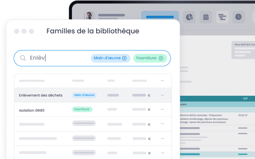 Avec Obat, vous pourrez créer ou importer des bibliothèques et classer vos différents ouvrages de charpente en fonction du prix de la main d’œuvre et du type de prestation : création, pose et traitement de charpentes, de bardages et d’ossatures en bois, travaux d’isolation de toiture, agencement des combles, couverture, pose de gouttière, conception et installation de fenêtre, de plancher et de terrasse, entretien et démoussage de toit, fabrication et pose d’escalier, etc.