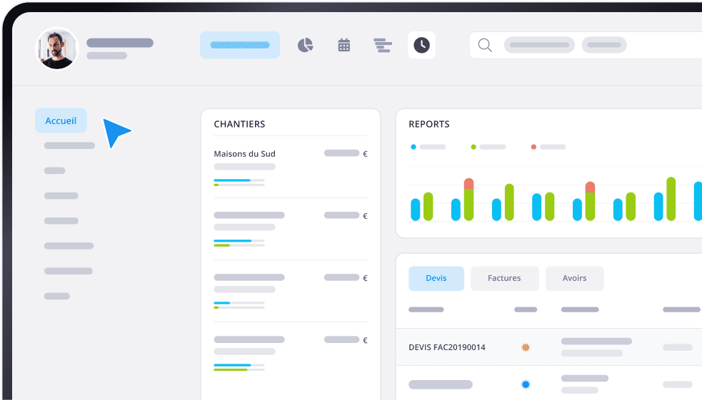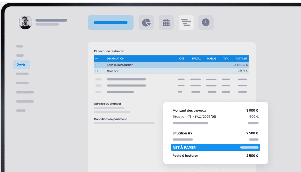 Plus besoin de tableurs ou de logiciels compliqués. Créez un devis, générez un acompte ou une facture intermédiaire en quelques clics, et suivez l’avancement du chantier sans perte de temps.