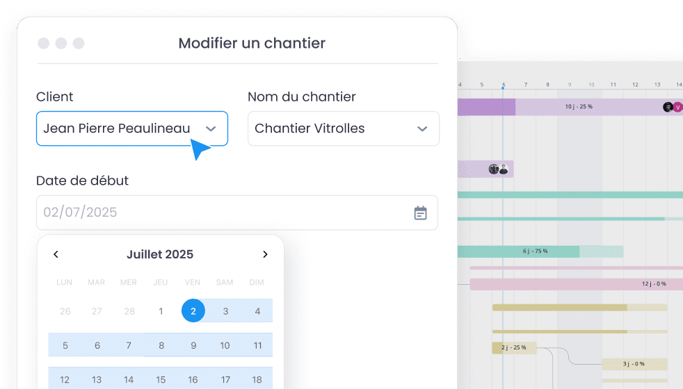 En automatisant la création de plannings détaillés, il vous aide à organiser vos semaines et à anticiper les problèmes éventuels. Grâce à un suivi graphique et collaboratif du projet, vous visualisez son avancement en temps réel et pouvez notifier vos équipes de tout changement.