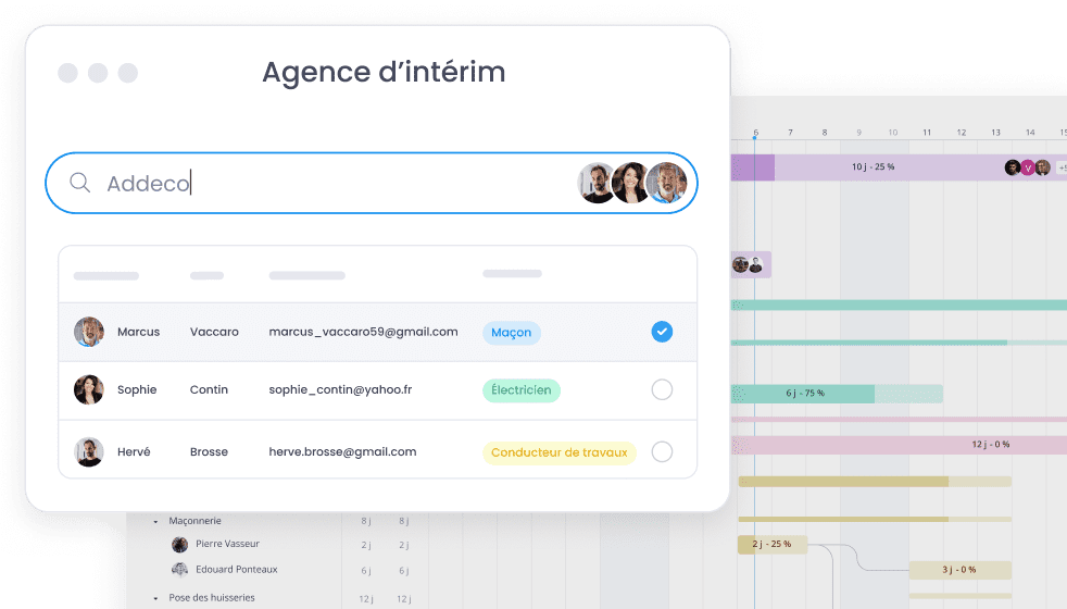 Faites appel à des intérimaires pour certains chantiers. Déterminez leur rôle et période de travail, renseignez leurs coordonnées. Stockez toutes les informations et les documents et réutilisez-les sur vos prochains projets.